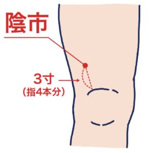 ⇨足にあるツボで、太ももの前外側、膝より少し上の大腿直筋腱の外側にあります。膝の上の上端の広い部分(膝蓋骨底)から3寸(指幅4本分)上がったところに位置します。